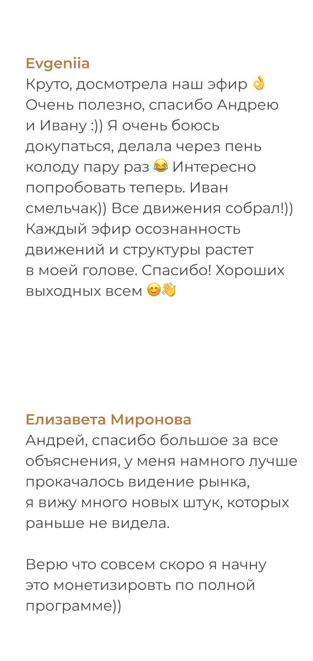 Дополнительные уроки, вебинары, разборы и другие активити для более глубокого изучения рыночных механик и на другие специальные темы от наставников школы. Не являются регулярными и анонсируются заранее.