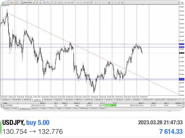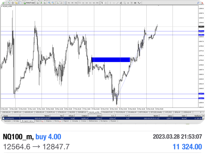 Сделка на продажу (шорт) сырье XAU/ USD 27 марта 2023, время в сделке 2 часа, прибыль 900$